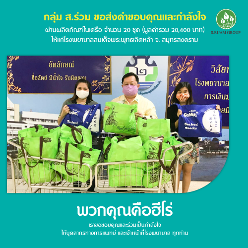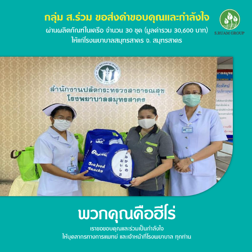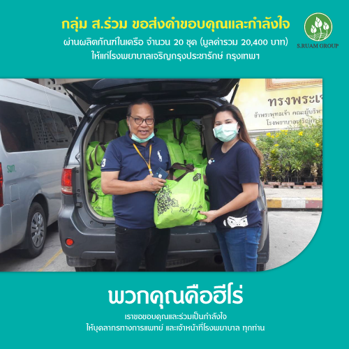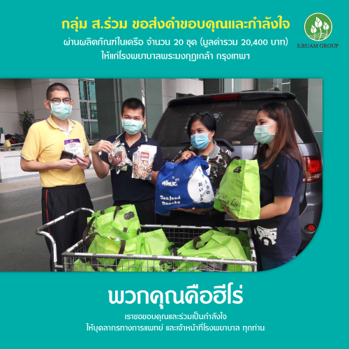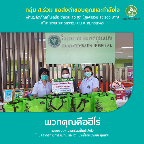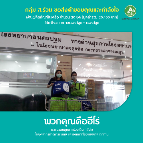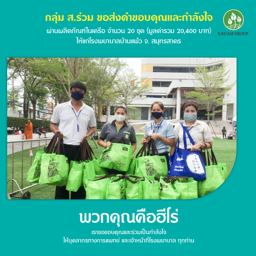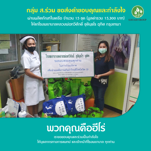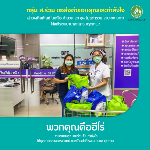 พวกคุณคือฮีโร่ กลุ่ม ส.ร่วม ขอส่งมอบผลิตภัณฑ์ทั้งหมดนี้ แทนคำขอบคุณ และเราจะคอยเป็นกำลังใจให้บุคลากรทางการแพทย์ทุกๆ ท่านในประเทศไทย ให้ฟันฝ่าวิกฤตการณ์ครั้งนี้ไปด้วยกัน ขอบคุณอย่างมากที่ดูแลรักษาประชาชนตลอดมา